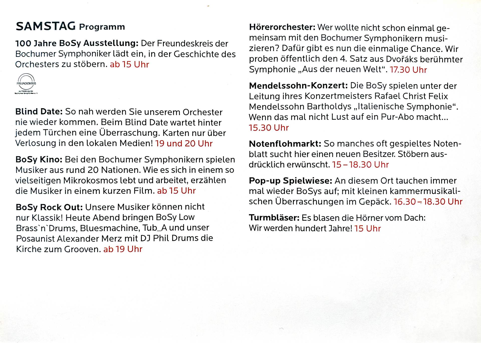 | 18. Mai 2019 100 JAHRE BOSY Opener Beginn 20.00 Uhr Anneliese Brost Musikforum Ruhr Marienplatz 1 44787 Bochum |