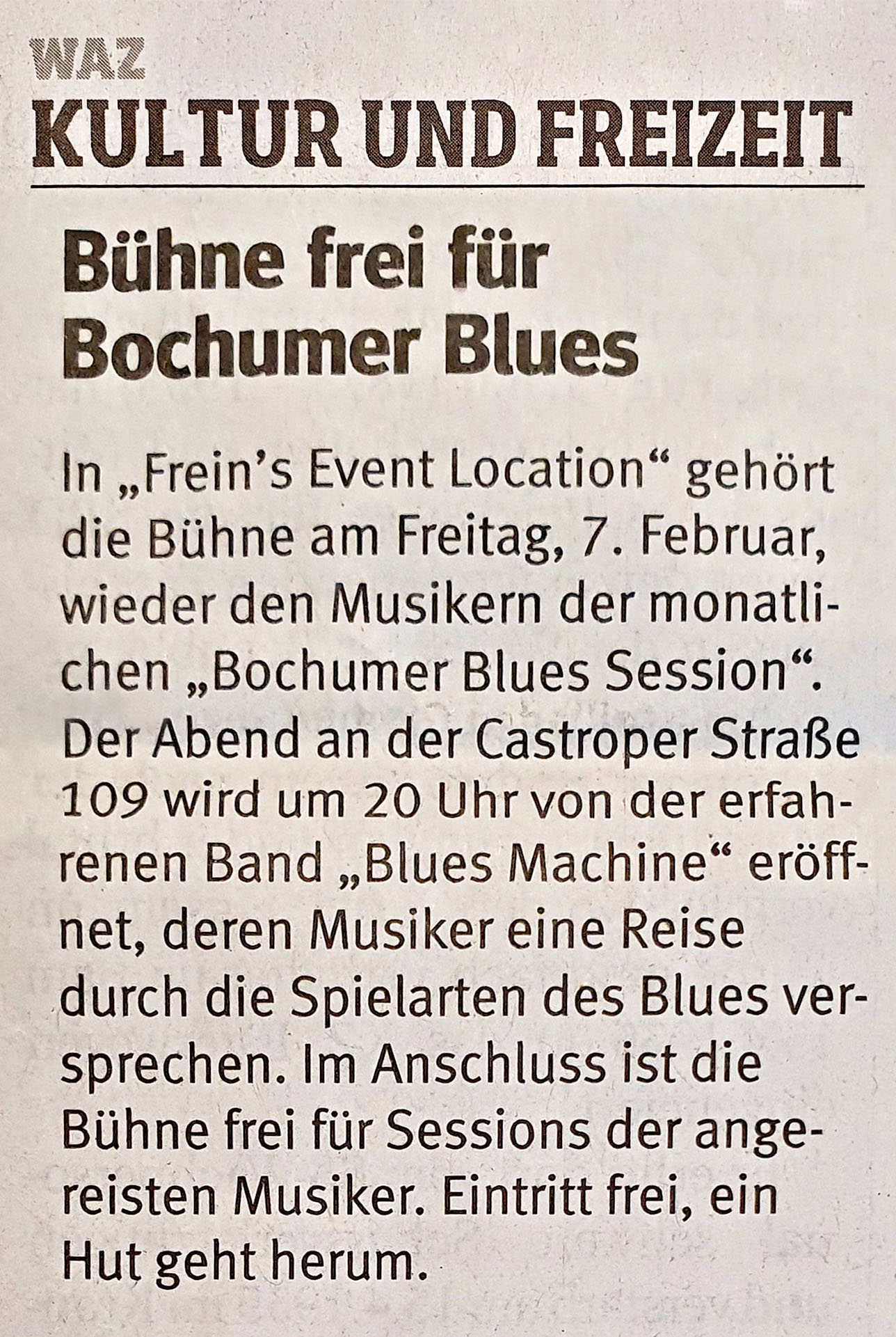 | 07. Februar 2020 Bochumer Blues Session Opener Beginn 20.00 Uhr Haus Frein Castroper Straße 109 44791 Bochum |