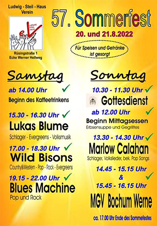 | Samstag · 20.08.2022 Bochum Ludwig-Steil-Haus-Verein Sommerfest Beginn: ca. 19:30 Uhr Rüsingstraße 1 44894 Bochum Telefon: 0234 532339 facebook: www.facebook.com/ Ludwig-Steil-Haus-eV-699830523445570 Website: www.lsh-werne.de |